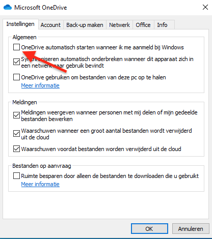 Als je sowieso geen OneDrive gebruikt (wat overigens best handig kan zijn, want je kunt dan op meerdere pc's bij je bestanden) dan kun je er ook voor kiezen om OneDrive helemaal uit te schakelen.