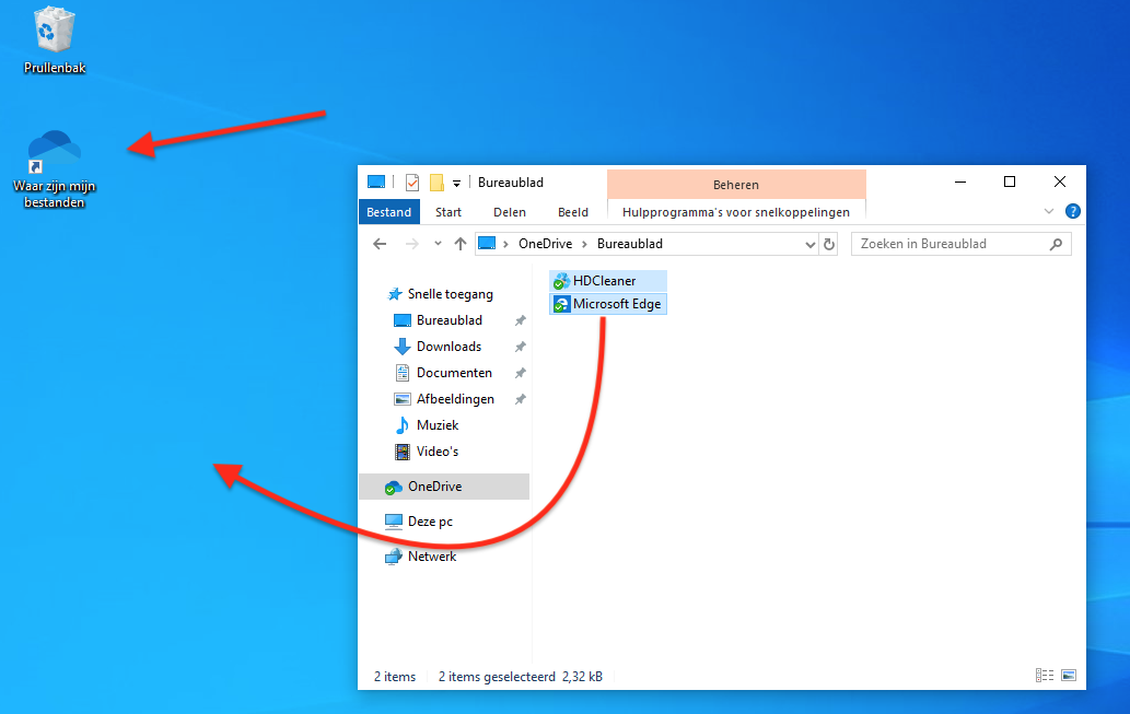 Nu verdwijnen eerst alle bestanden en snelkoppelingen van je bureaublad! Maar geen paniek: deze kun je dan weer terugzetten door te klikken op het Waar zijn mijn bestanden-icoontje op je bureaublad en deze uit OneDrive weer naar je bureaublad te slepen.