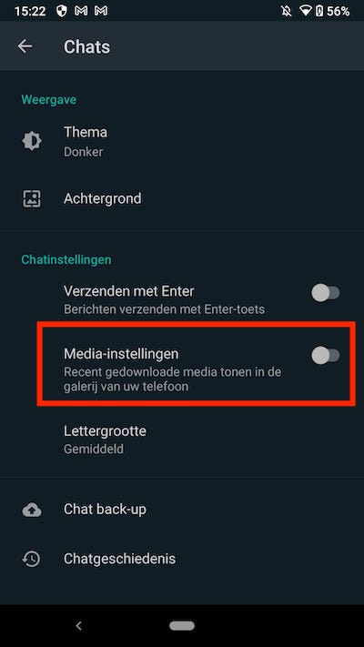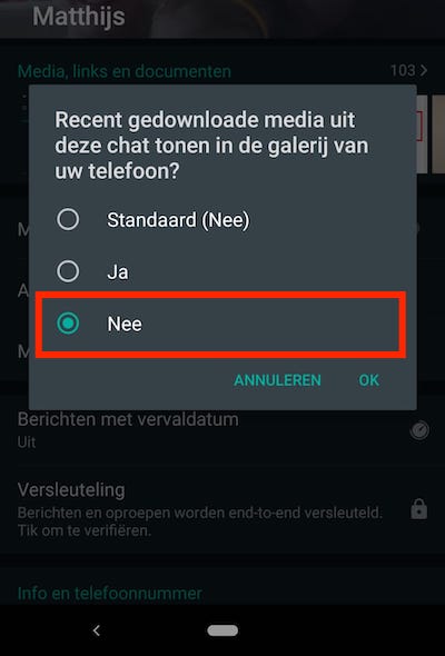 Om geen foto's en video's te bewaren in je galerij (Google Foto's ) van WhatsApp op een Android telefoon kies je voor:
