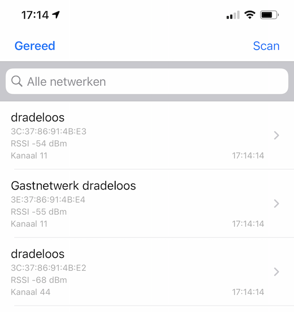 6. Na de scan/analyse zie je de resultaten voor je thuisnetwerk en andere netwerken in de buurt. Je ziet de kanalen die gebruikt worden, de RSSI (sterkte) in dBm (hoe dichter bij 0 hoe beter: het netwerk bovenaan heeft het beste signaal) en de MAC-adressen van de draadloze netwerken.