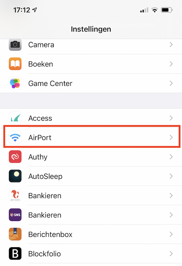2. Als je de AirPort Utility app op je iPhone of iPad hebt geïnstalleerd dan ga je naar de Instellingen-app en scroll je een eind naar beneden tot je tussen al je apps AirPort ziet staan. Daar tik je op.