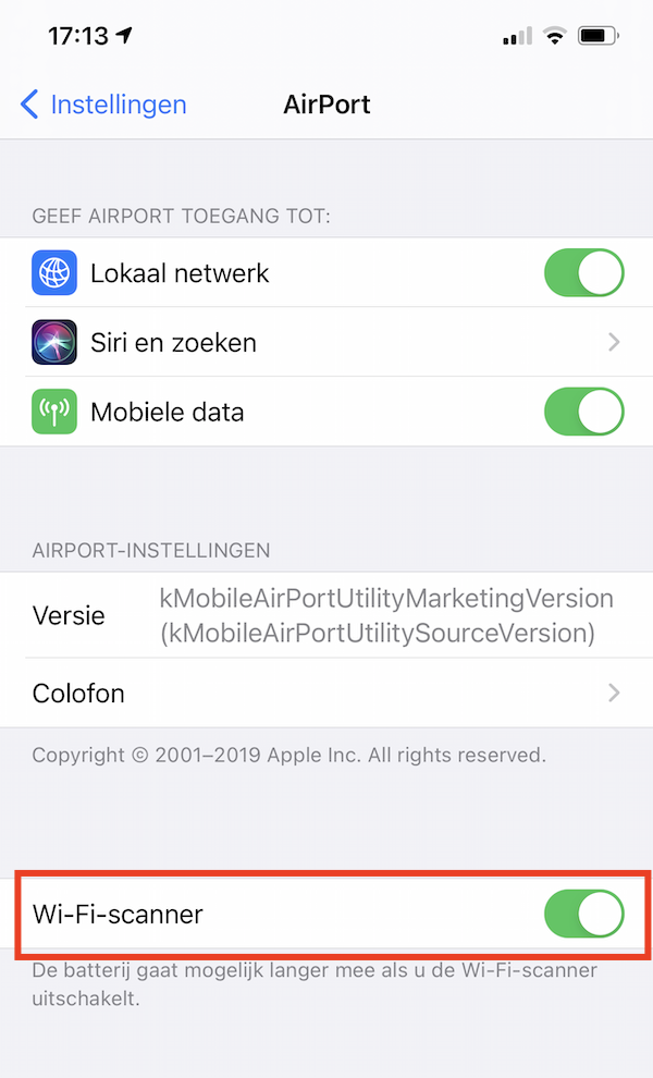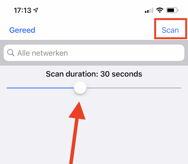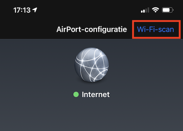 4. Open daarna de AirPort Utility op het beginscherm van je iPhone (of iPad) en klik bovenaan op Wi-Fi-scan (deze functie heb je net aangezet in de Instellingen en die zie je anders niet).