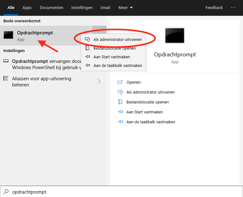 b. Rechtsklik op de gevonden Opdrachtprompt-app en kies voor Als administrator uitvoeren