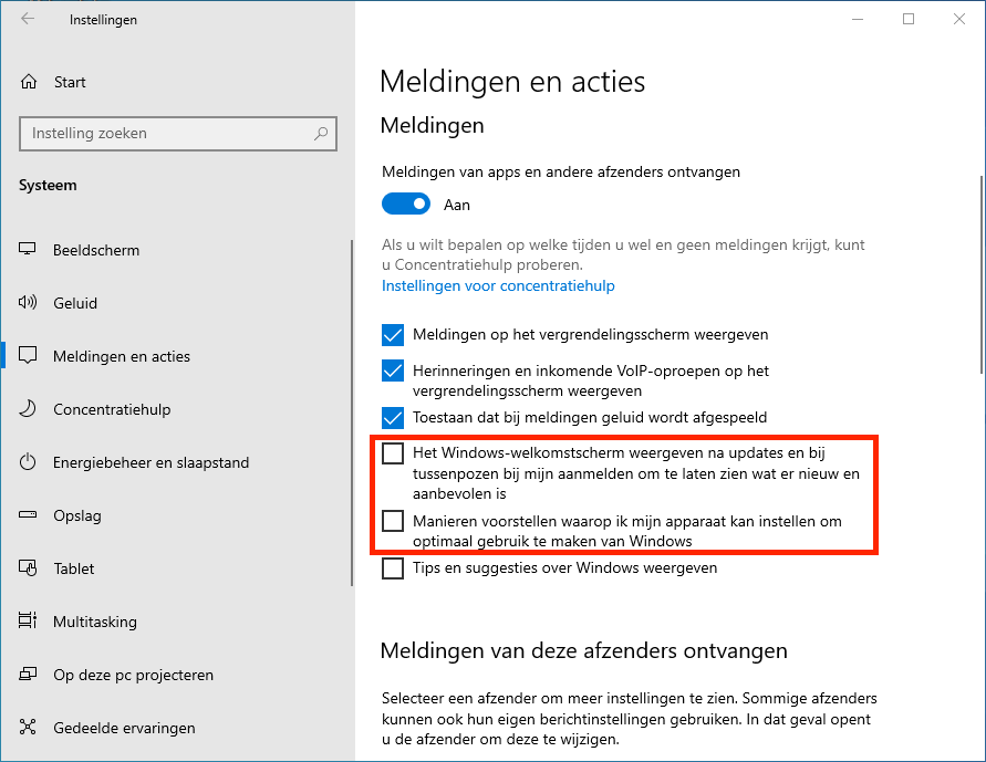 - 'Het Windows-welkomstscherm weergeven na updates en bij tussenpozen bij mijn aanmelden om te laten zien wat nieuw en aanbevolen is' (dit om na grote updates een venster met een overzicht van nieuwe functies te voorkomen)