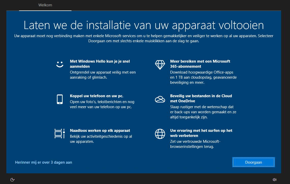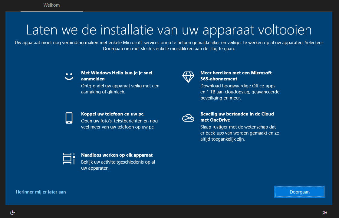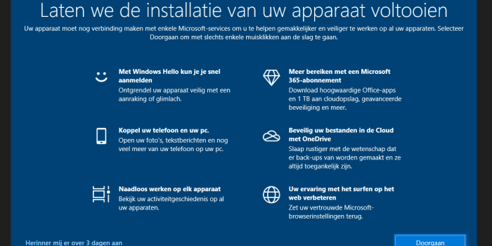 Tegenwoordig laat Windows 10 na bijna elke update na het opnieuw opstarten een 'welkomstscherm' zien met aanbevelingen over het instellen van OneDrive, het kopen van Office365, het aansluiten van je telefoon en andere ongevraagde adviezen. Dit scherm zal je vast bekend voorkomen en ziet er zo uit: