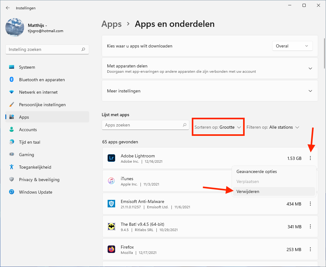 Sorteer de lijst met apps op Grootte en kies de apps die je niet gebruikt en die je wilt verwijderen door op de drie puntjes en Verwijderen te klikken: