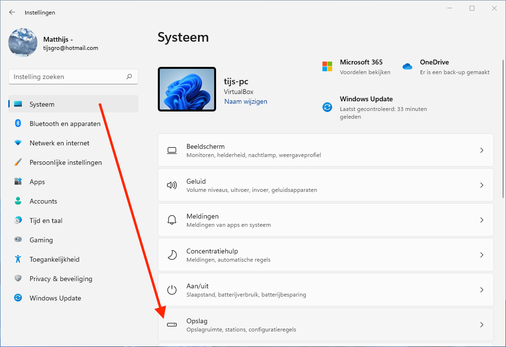 1. Ga naar Instellingen (klik Startmenu - blauwe vlag-knop - en dan rechtboven Instellingen) en kies Systeem | Opslag: