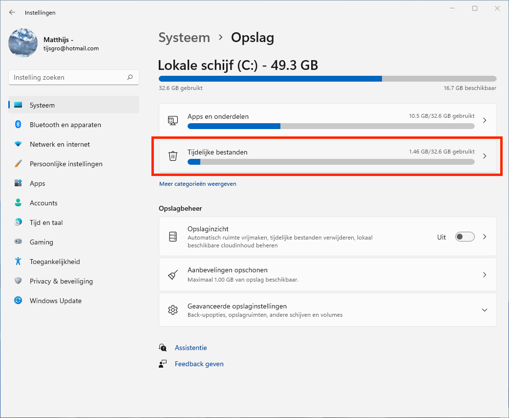 Onder Opslag | Aanbevelingen opschonen kun je behalve de Tijdelijke bestanden die we net ook opgeruimd hebben verder nog Grote of ongebruikte bestanden, Bestanden gesynchroniseerd met de cloud (als je OneDrive gebruikt) en Ongebruikte apps opruimen.