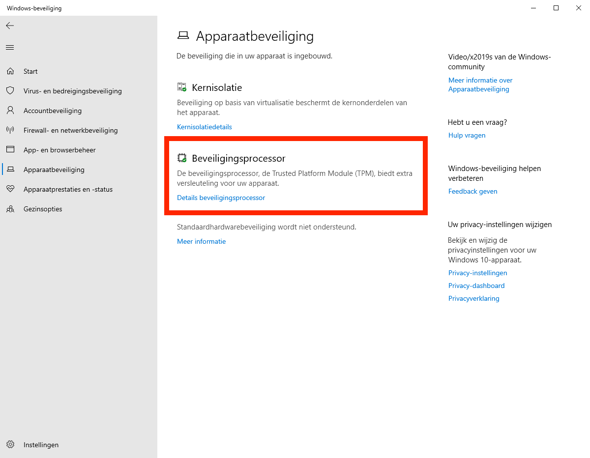2. In Windows-beveiliging klik je links op Apparaatbeveiliging. Als daar Beveiligingsprocessor vermeld staat met dan klik je op Details beveiligingsprocessor: