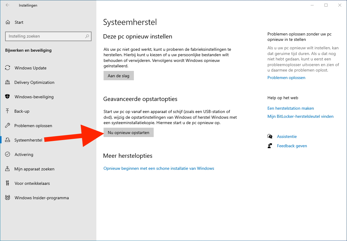 Ter geruststelling: je gaat niks doen met systeemherstel, dit is alleen een makkelijke manier om in de BIOS te komen van je pc. Want daar zul je Secure Boot of Beveiligd opstarten aan moeten zetten.