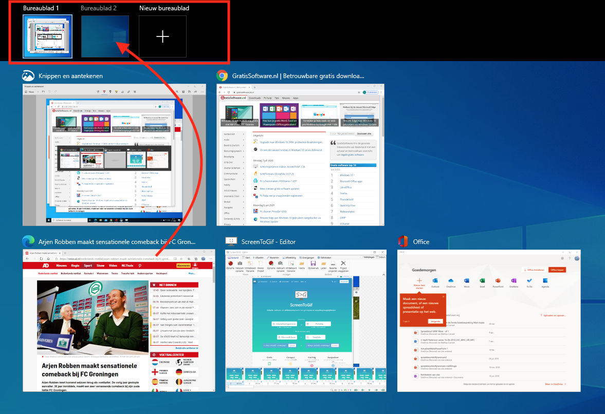 Je kunt daarna programma's naar je andere bureaublad slepen. Wisselen tussen bureaubladen doe je door naar Taakweergave te gaan (Windows-toets Tab) en op het gewenste bureaublad te klikken of door de toetsencombinatie Ctrl Windows-toets pijltje (naar links of rechts).