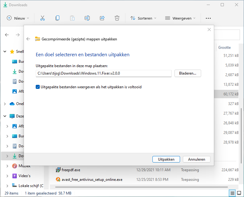 Als je een andere map wilt kiezen klik dan op bladeren, selecteer de map die je wilt en klik daarna op Uitpakken