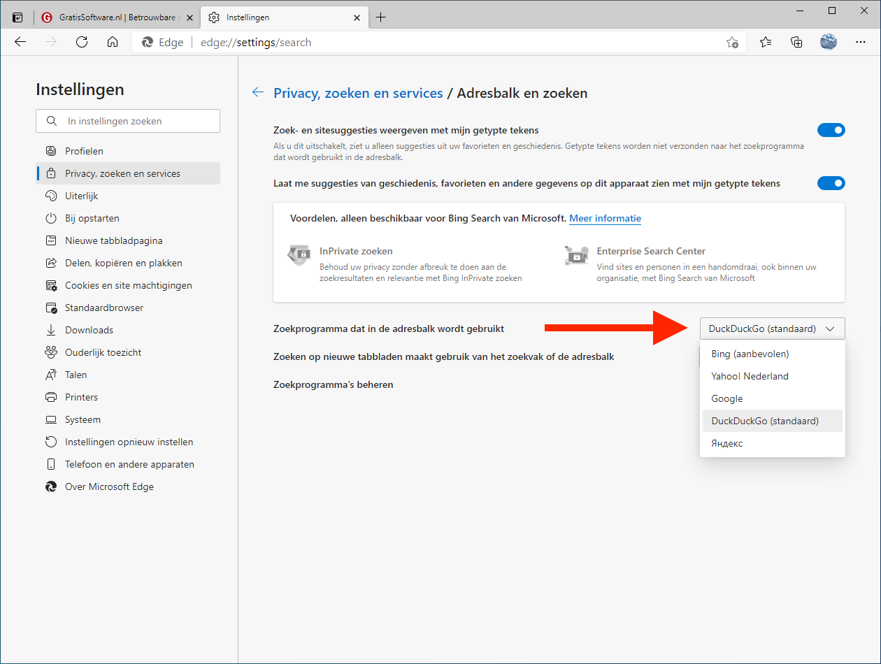 • Kies achter Zoekprogramma dat in de adresbalk gebruikt wordt je gewenste zoekmachine
