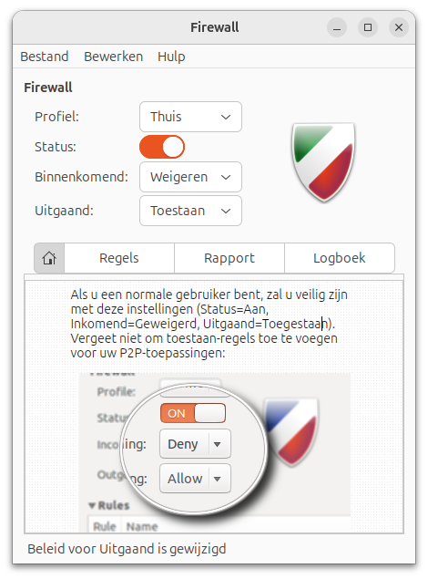 Nu heb je ufw (de firewall) geactiveerd in Ubuntu Linux. Inkomend verkeer wordt standaard geweigerd (wat voor normale gebruikers onder de meeste omstandigheden prima zal werken, alleen P2P heeft soms uitzonderingen nodig). Mailen en internetten gaat gewoon. Uitgaand verkeer wordt toegestaan (en dat moet ook want anders werken applicaties niet). Je kunt zelf regels maken voor applicaties, maar daarvoor zul je je in de documentatie moeten verdiepen.