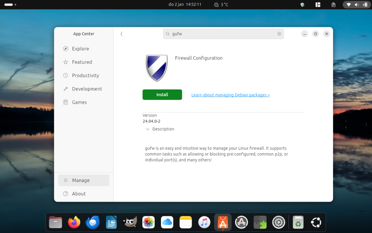 3. Klik Installeren/Install bij Firewall Configuration (de andere naam van Gufw) en toets je wachtwoord in