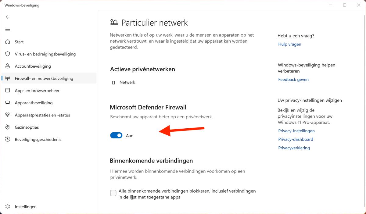 2. In Windows-beveiliging ga je naar Firewall- en netwerkbeveiliging en je kijkt voor alle soorten netwerken of de firewall is ingeschakeld (particulier is je thuisnetwerk bijvoorbeeld en openbaar is buitenshuis)