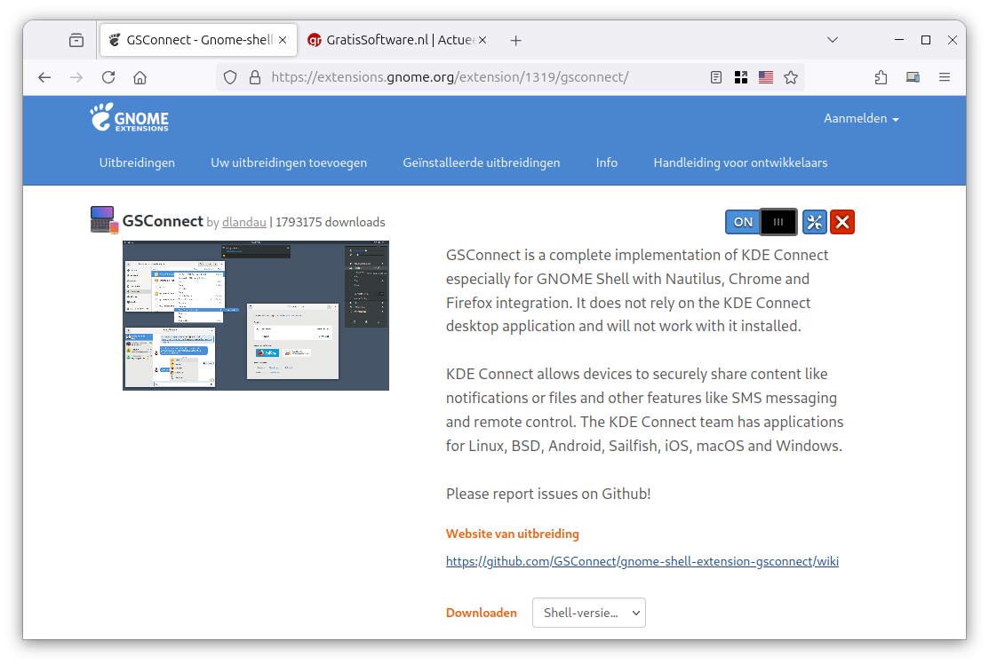 1. We hebben de Gnome extensie GSConnect nodig (een aanpassing van KDE Connect voor de Gnome desktop). Ga in je web browser naar de website van GSConnect op extensions.gnome.org en klik op Installeren en zet zo de knop rechtsboven op ON. De Gnome extensie GSConnect wordt nu geïnstalleerd in Ubuntu.