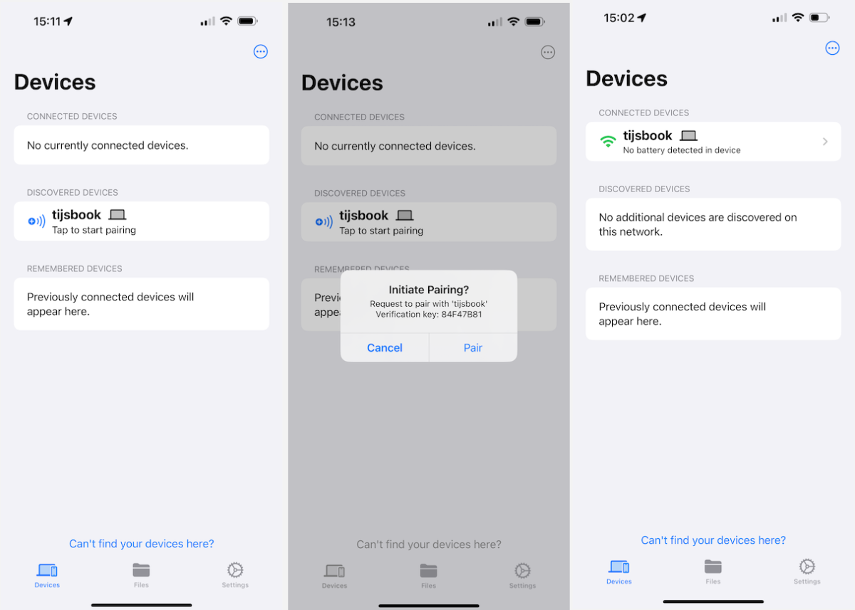 2. Open KDE Connect op je iPhone of Android telefoon (het voorbeeld hieronder is op iPhone) en klik op de naam van je laptop of pc om te beginnen met het paren van de apparaten. Klik op Pair en op je computer klik je op Accept als er een melding met een verzoek om te paren verschijnt.