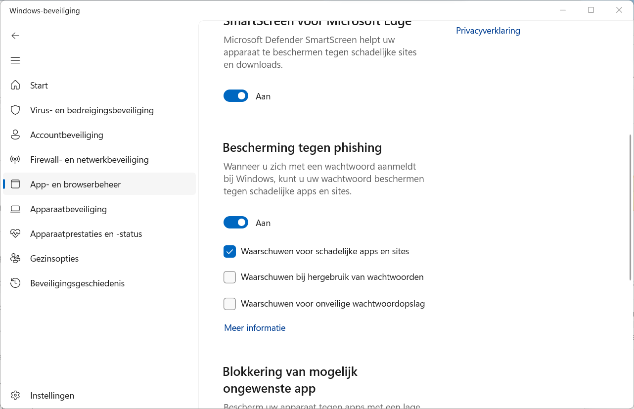 - Onder Windows-beveiliging | App- en browserbeheer kun je (onderaan) Bescherming tegen phishing aanzetten zodat Windows waarschuwt voor mogelijk schadelijke apps en websites