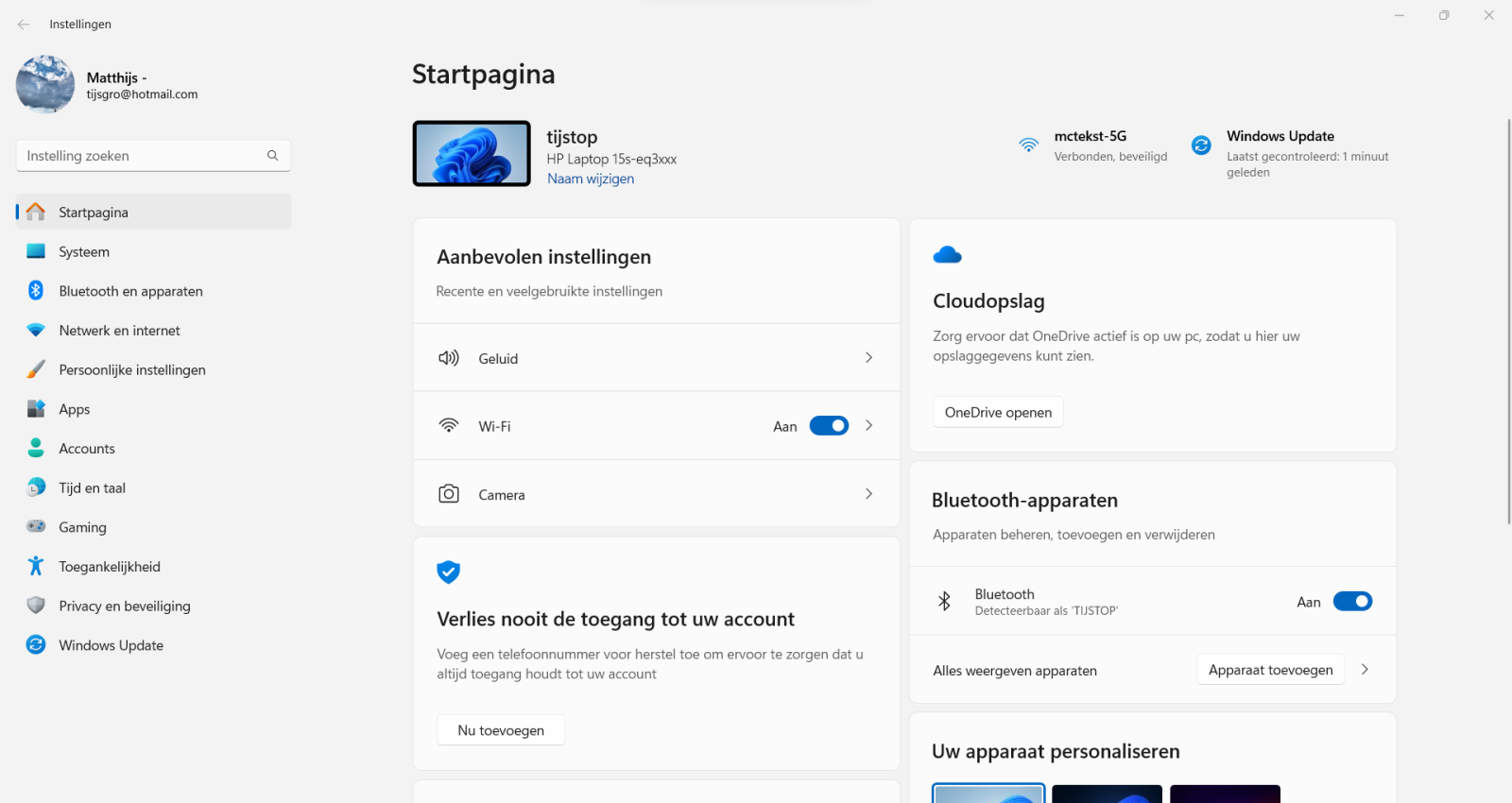 - Nieuwe startpagina van het Instelling-scherm