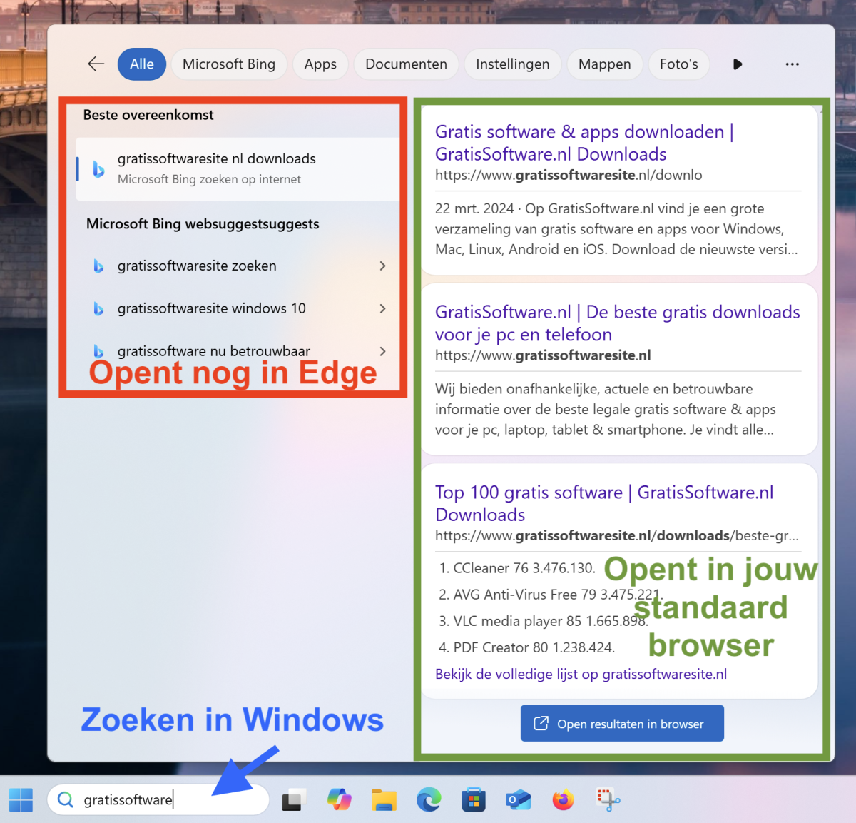 Bij de zoekresultaten van het zoekvak in de taakbalk van Windows 10 en 11 is wel weer een bijzonder Microsoft-momentje ingebouwd: als je Chrome, Firefox of een andere standaard browser hebt, dan opent die wel als je op de zoekresultaten aan de rechterkant klikt (groen omkaderd in de afbeelding), maar NIET als je op de Bing suggesties aan de linkerkant klikt (roodomkaderd). Want dan opent nog altijd gewoon Edge - ook als je Firefox of Chrome als standaard browser hebt ingesteld.