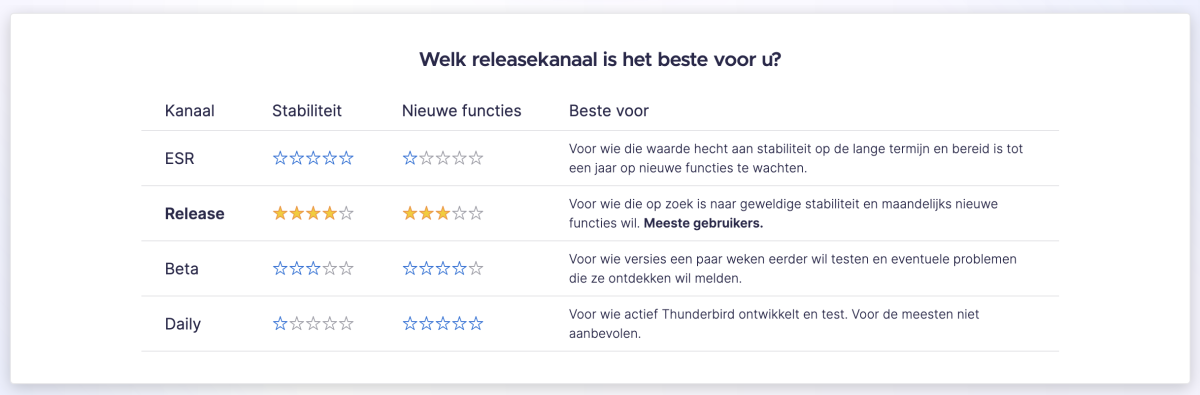 De ESR-versie van Thunderbird is de meest stabiele versie. Je krijgt één keer per jaar nieuwe functies en verder alleen beveiligings- en onderhoudsupdates. De Release-versie is ook stabiel, maar ietsje minder volgens Mozilla, en is vooral gericht op snel nieuwe functies naar gebruikers brengen. Dus wil je de grootste stabiliteit of sneller nieuwe functies? Dat is de vraag die je zult moeten beantwoorden.