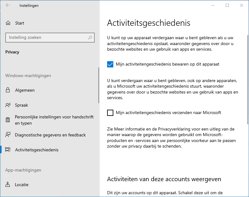 - En als je toch bezig bent, ga dan ook even naar Instellingen | Privacy | Activiteitsgeschiedenis en haal het vinkje weg bij 'Mijn activiteitengeschiedenis verzenden naar Microsoft' (dit is alleen handig als je meerdere pc's of laptops gebruikt en op het andere apparaat verder wilt gaan met waar je gebleven was op het ene apparaat)