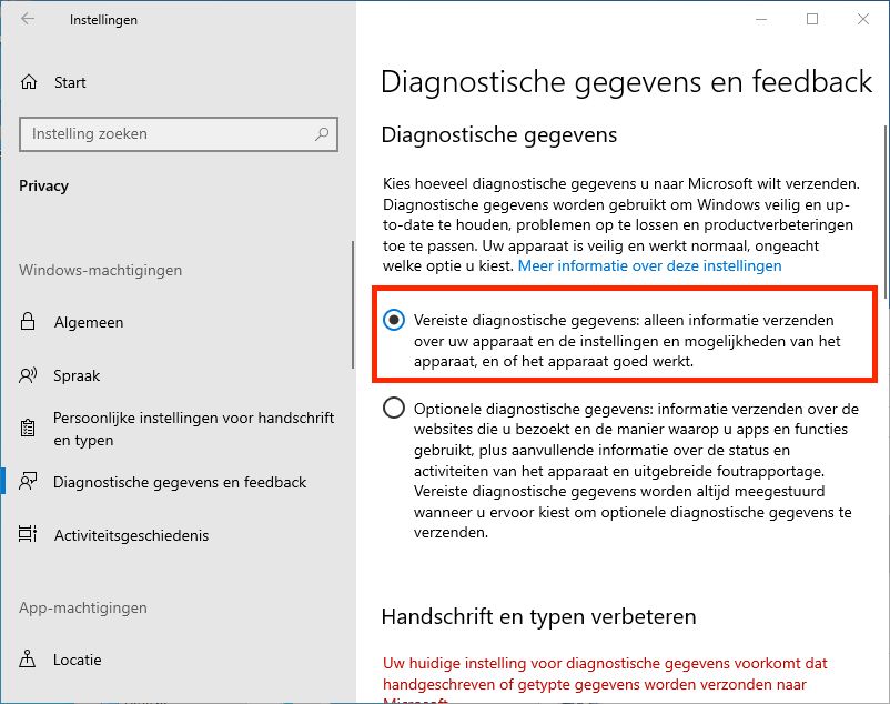 - Ga naar Instellingen | Privacy | Diagnostische gegevens en feedback en kies voor 'Vereiste diagnostische gegevens' om zo min mogelijk persoonlijke informatie met Microsoft te delen.