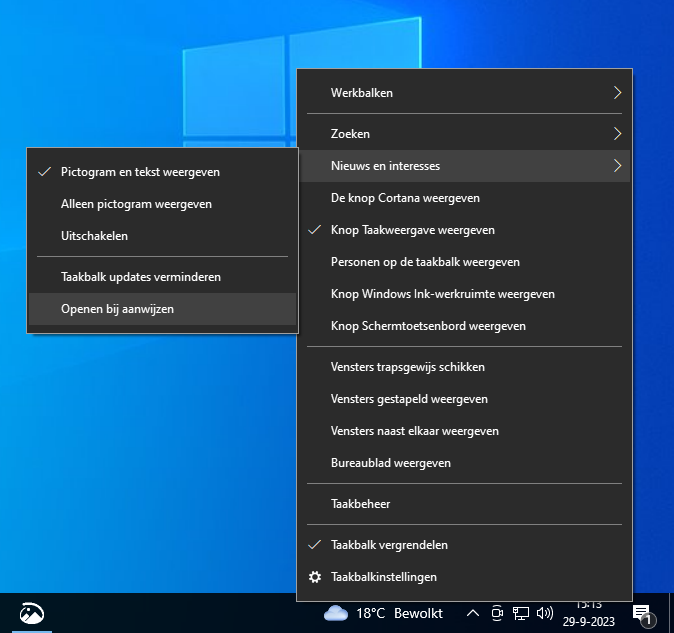 Nu zie je wel het weerbericht op de taakbalk maar opent de widget van Nieuws en interesses alleen als je er op klikt.