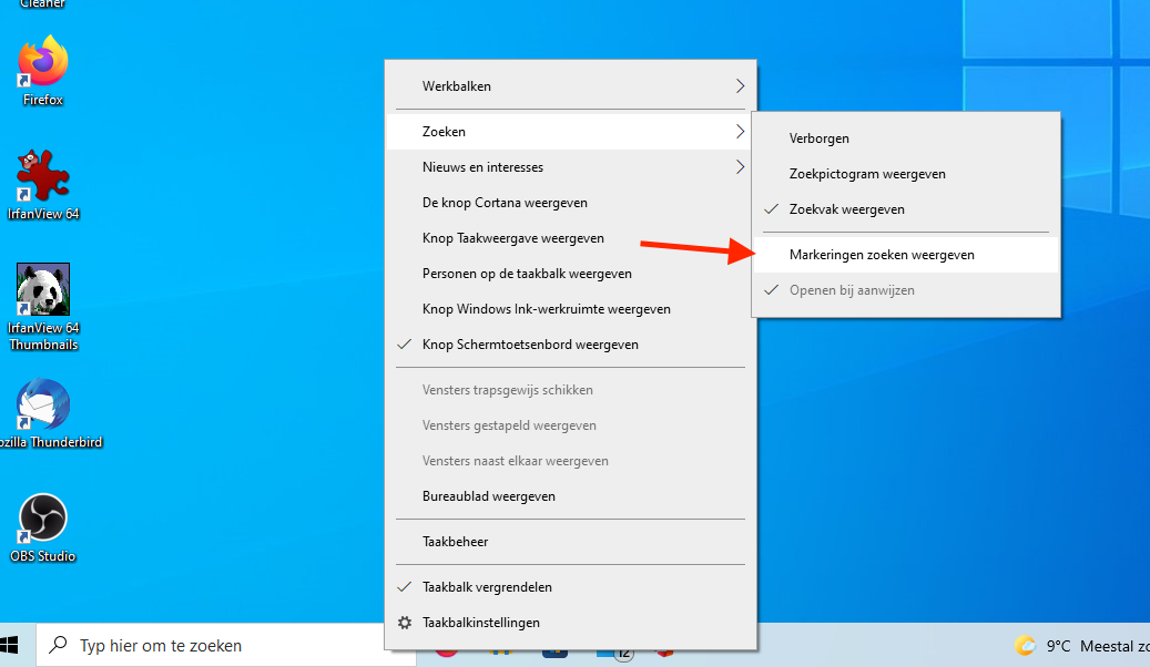 - Rechtsklik op de taakbalk, ga naar Zoeken en haal het vinkje weg bij 'Markeringen zoeken weergeven'