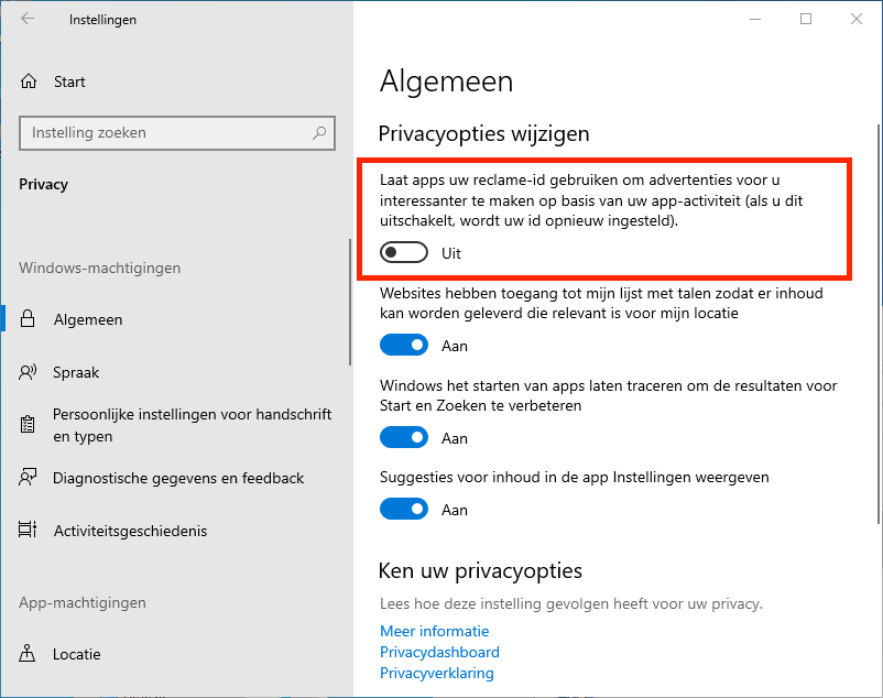 - Ga naar Instellingen | Privacy | Algemeen en zet de schakelaar Uit bij 'Laat apps uw reclame-id gebruiken...'