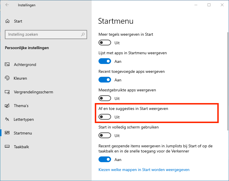 - Ga naar Instellingen | Start | Startmenu en zet de schakelaar uit bij 'Af en toe suggesties in Start weergeven'