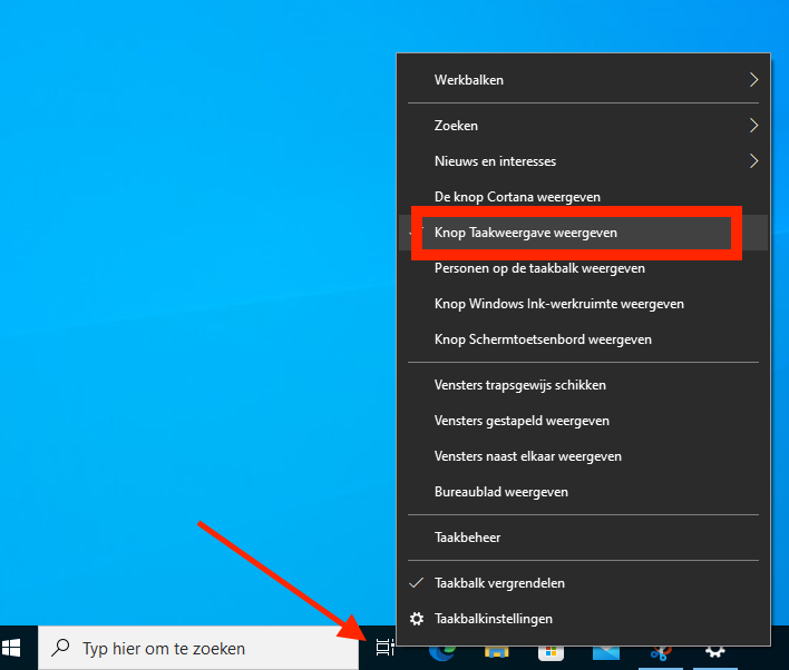 - Rechtsklik op de taakbalk en haal het vinkje weg bij 'Knop Taakweergave weergeven'