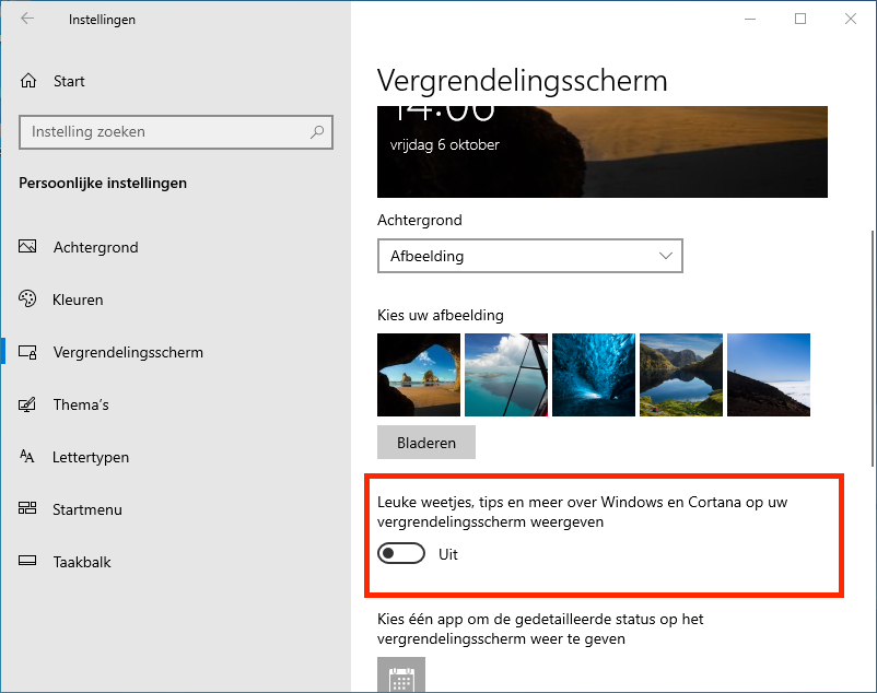 - Ga naar Instellingen | Persoonlijke instellingen | Vergrendelingsscherm en zet de schakelaar Uit bij 'Leuke weetjes, tips en meer over Windows en Cortana op uw vergrendelingsscherm weergeven...' Dit kan alleen als je een Afbeelding of Diavoorstelling als achtergrond hebt.