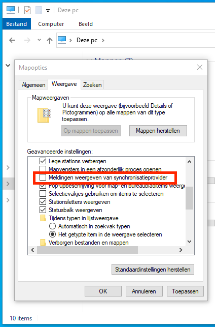 • Open Windows Verkenner en kies menu Bestand | Map- en zoekopties wijzigen. Ga dan naar tabblad Weergave en haal het vinkje weg bij 'Meldingen weergeven van synchronisatieprovider' en klik Toepassen en OK.