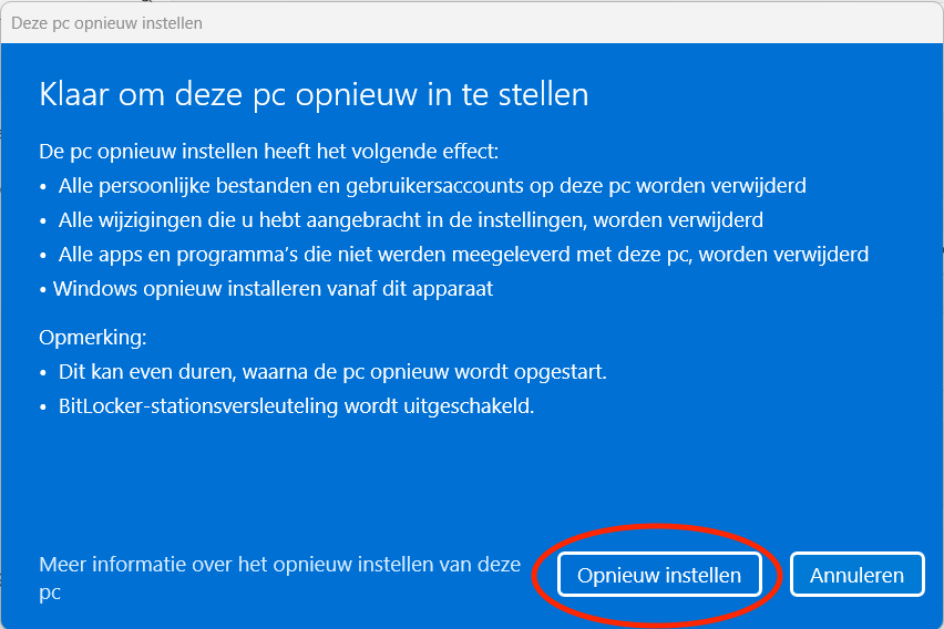 5. Kies Opnieuw instellen en je pc wordt gewist (gegevens onherstelbaar verwijderd) en Windows 10 of 11 opnieuw geïnstalleerd.