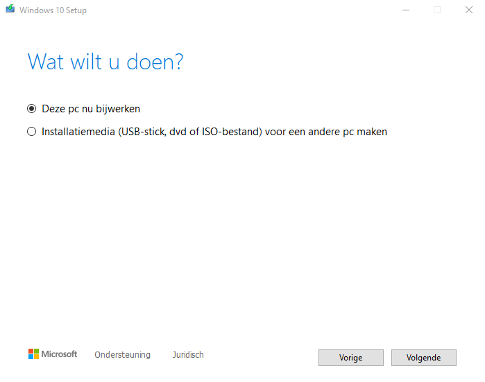 je kiest voor Deze pc nu bijwerken (voor de meeste mensen aan te raden) of je maakt hiermee een installatie-usb of -dvd met Windows 10 voor een nieuwe, schone installatie (voor gevorderden):