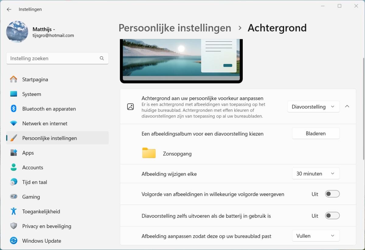 - Diavoorstelling - Wil je de hele dag door wisselende bureaubladachtergronden dan kun je ook kiezen voor de Diavoorstelling. De standaardmap van Windows 11 hiervoor heet Zonsopgang. Je kunt ook naar de map C:\Windows\Web|Wallpaper gaan en een ander thema kiezen. Of je kunt een eigen map met afbeeldingen maken en deze selecteren voor je diavoorstelling op het bureaublad! Dat is natuurlijk wel zo leuk. En dan kun je eigen vakantiefoto's of familiefoto's als wisselende bureaubladachtergrond instellen.