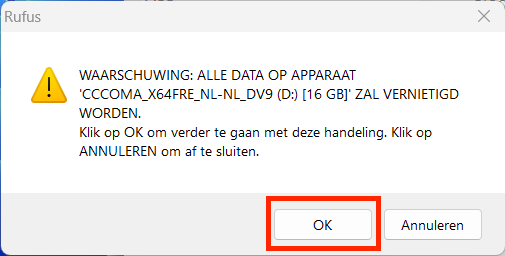 • Bij de waarschuwing van Rufus dat alle data op je USB-stick vernietigd zal worden klik je weer OK