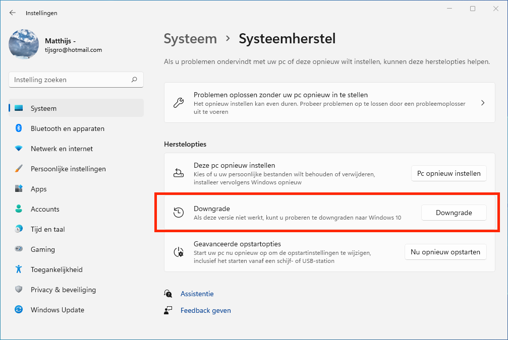 1. Ga in Windows 11 naar Instellingen | Systeem | Systeemherstel en klik op Downgraden: