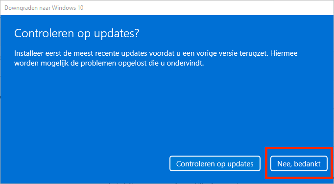 Klik Nee, bedankt bij Controleren op updates (want je wilt gewoon terug naar Windows 10):