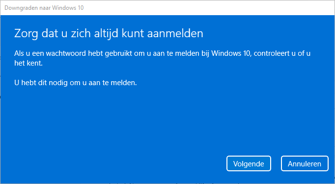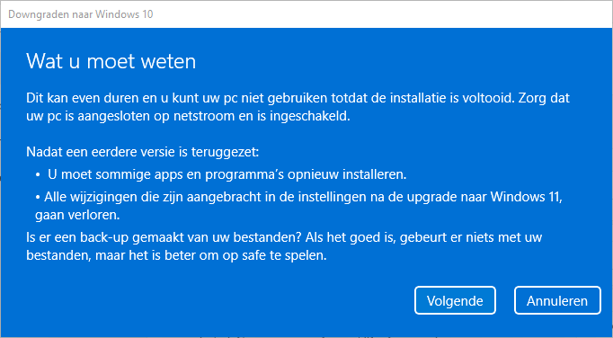 Als de Downgrade-optie (zoals hierboven uitgelegd) in Instellingen grijs is en niet aanklikbaar dan ben je te laat en zul je Windows 10 helemaal opnieuw moeten installeren. Je gegevens zul je dan verliezen. Maak dan dus een backup van al je gegevens en instellingen. Die zul je daarna handmatig moeten terugzetten. Of blijf toch bij Windows 11.