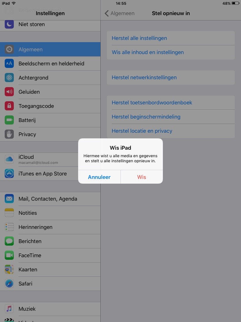 Bij ons hielp dit helaas niet. De iPad 2 bleef nog altijd tergend langzaam. Dan maar grondiger te werk gaan: alle inhoud en instellingen wissen.