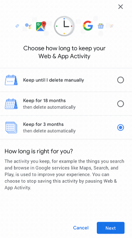 Met de 'auto-delete'-functie (automatisch verwijderen) kun je Web- en app-activiteiten (waaronder zoekgeschiedenis) en Locatiegeschiedenis na drie of 18 maanden automatisch weggooien in je Google account. Google geeft dan nog wel suggesties en gepersonaliseerde advertenties, maar alleen op basis van gegevens van de laatste maanden. Een soort tussenweg tussen geheel uitschakelen en alles bewaren dus.