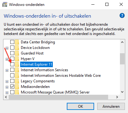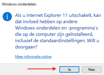 Mocht je Internet Explorer voor een bepaalde applicatie toch nog nodig hebben dan zet je gewoon het vinkje weer terug bij Internet Explorer 11 bij Windows-onderdelen in- of uitschakelen.