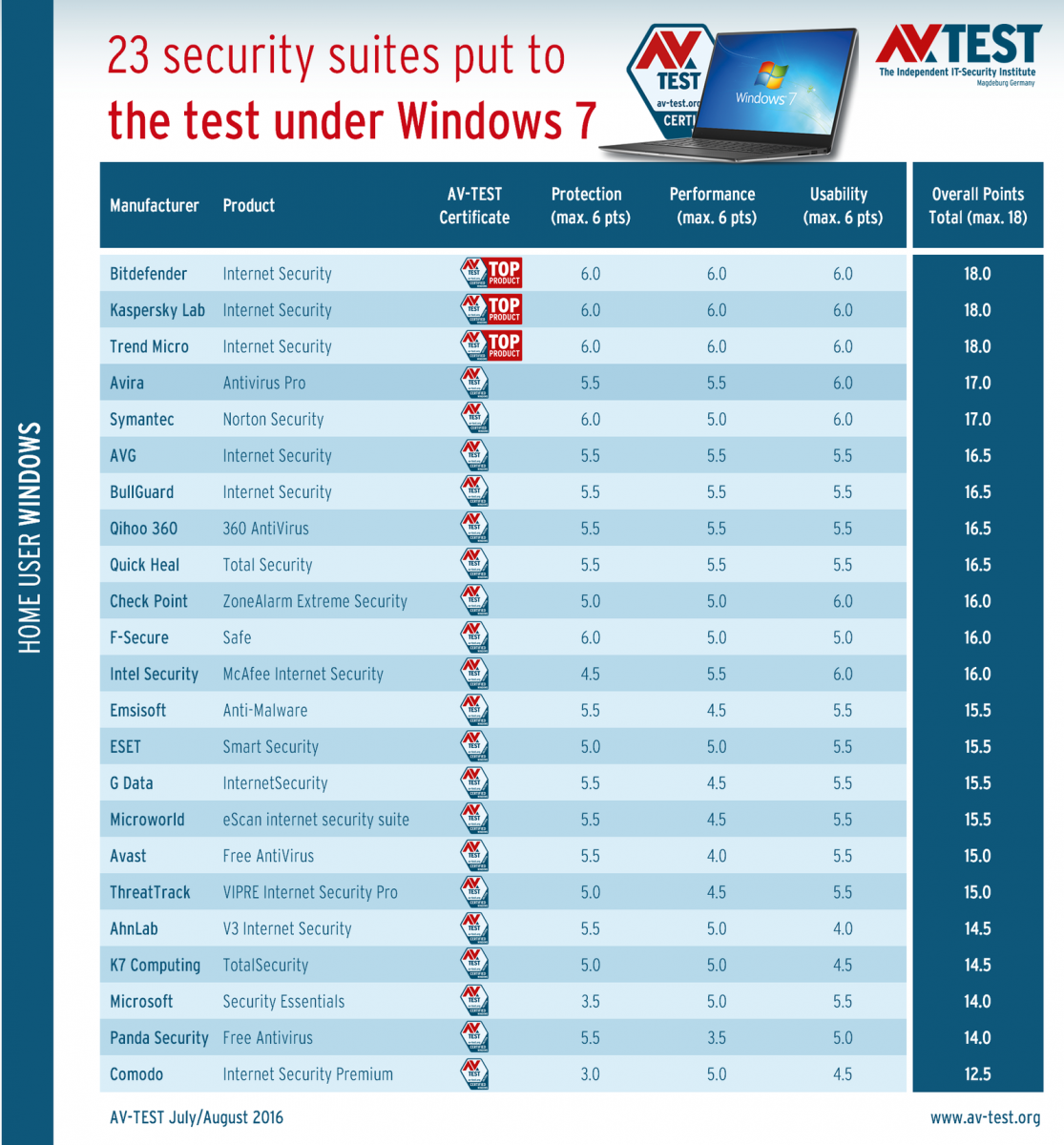 Het Duitse test-instituut AV-Test onderzoekt enkele keren per jaar de mate van bescherming, systeemvertraging en het aantal vals positieven van virusscanners. In juli en augustus werden anti-virus producten voor Windows 7 getest. Bij de tests werd de beveiliging tegen 162 zero-day aanvallen (nieuwe bedreigingen) en ruim 15.000 reeds wijdverspreide virussen gemeten.