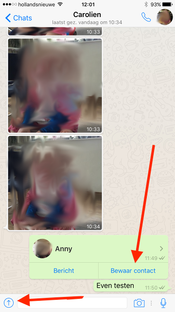 De ontvanger kan nu kiezen voor Bewaar contact om deze op te slaan in zijn contactenlijst of Bericht kiezen om gelijk een appje aan deze persoon te sturen.