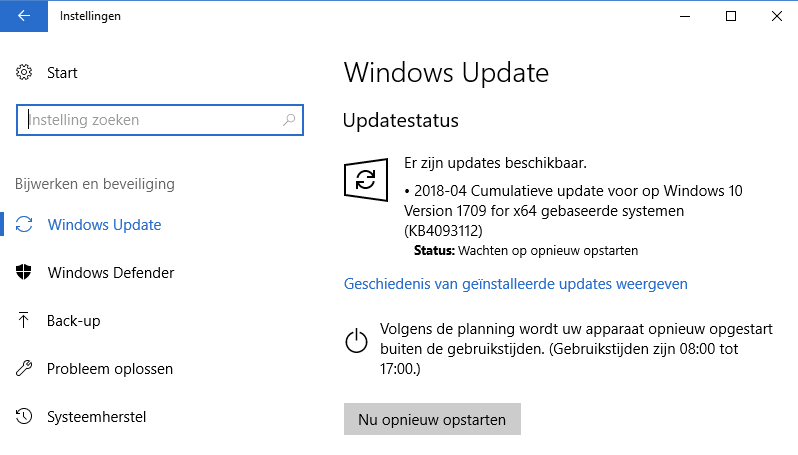 De Herfst makersupdate van Windows 10, met versienummer 1709, wordt sinds 17 oktober 2017 gefaseerd uitgerold. Het kan zijn dat je nog Windows 10 met versienummer 1703 (Makersupdate) hebt - onder Instellingen | Systeem | Info kun je kijken welk Windows 10 versienummer je hebt. Wacht dan rustig af tot je de Herfst makersupdate krijgt aangeboden. Windows 1703 krijgt ook gewoon nog maandelijkse updates. De volgende versie - Windows 1803 - wordt in april verwacht.