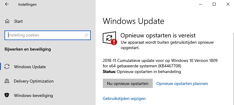 Op 14-11 Tweede beveiligingsupdate voor 1809 (KB4467708) automatisch aangeboden gekregen en geïnstalleerd. Geen enkel probleem. Build is nu 17763.134.