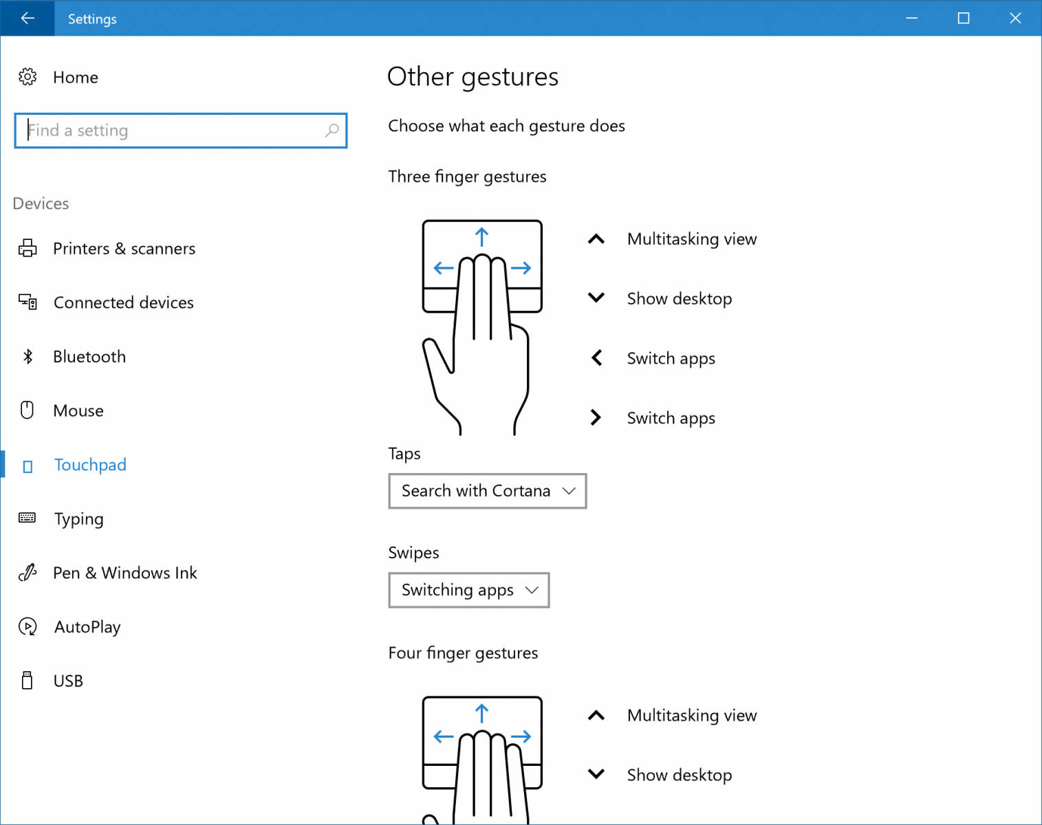 Gisteren heeft Microsoft Build 14946 uitgebracht van de Insider Preview. In deze build kun je voor je touchpad - net als bij macOS - zelf veegbewegingen met drie of vier vingers instellen om bepaalde acties uit te voeren (Instellingen | Apparaten | Touchpad).